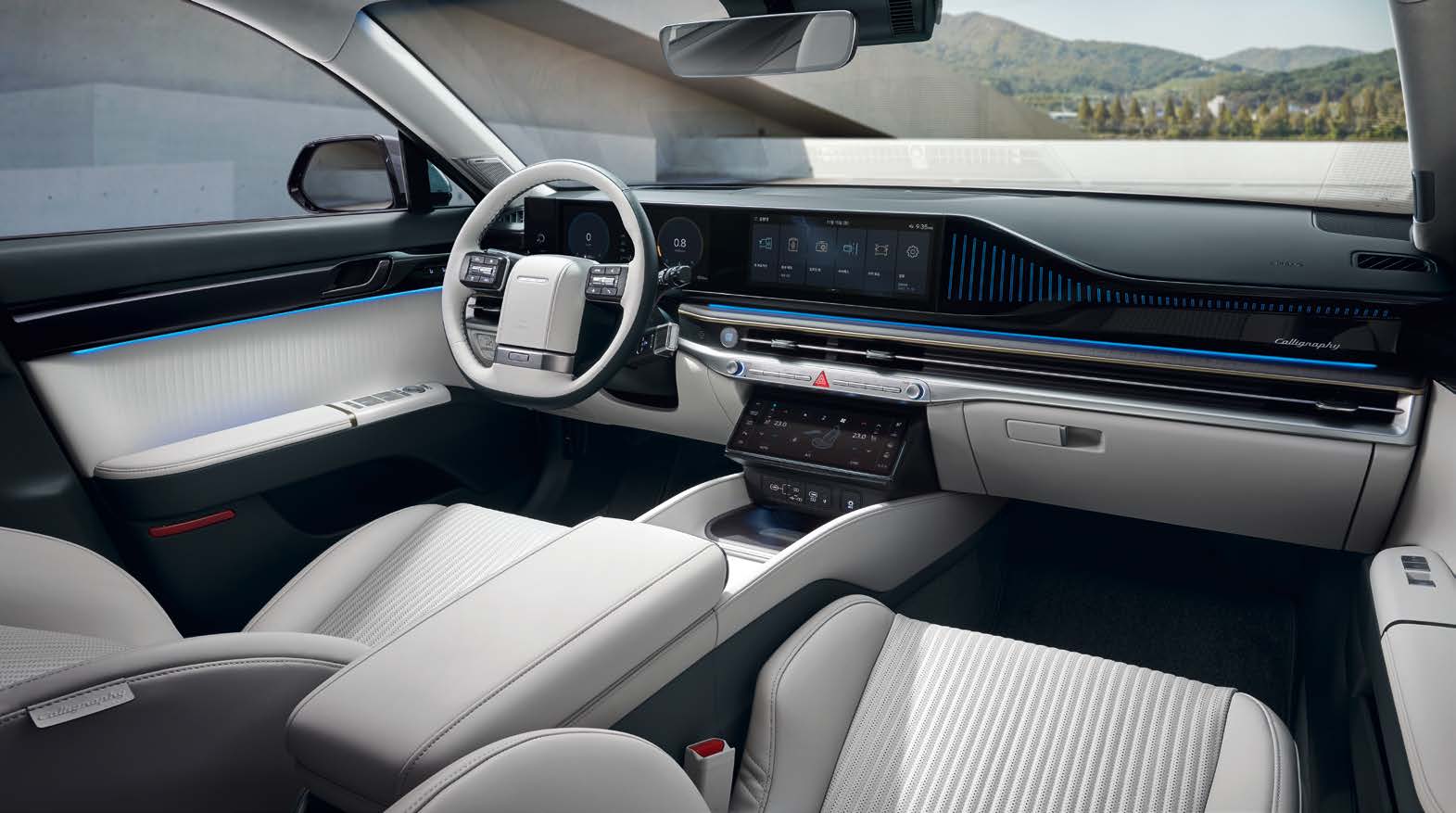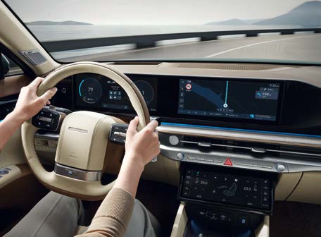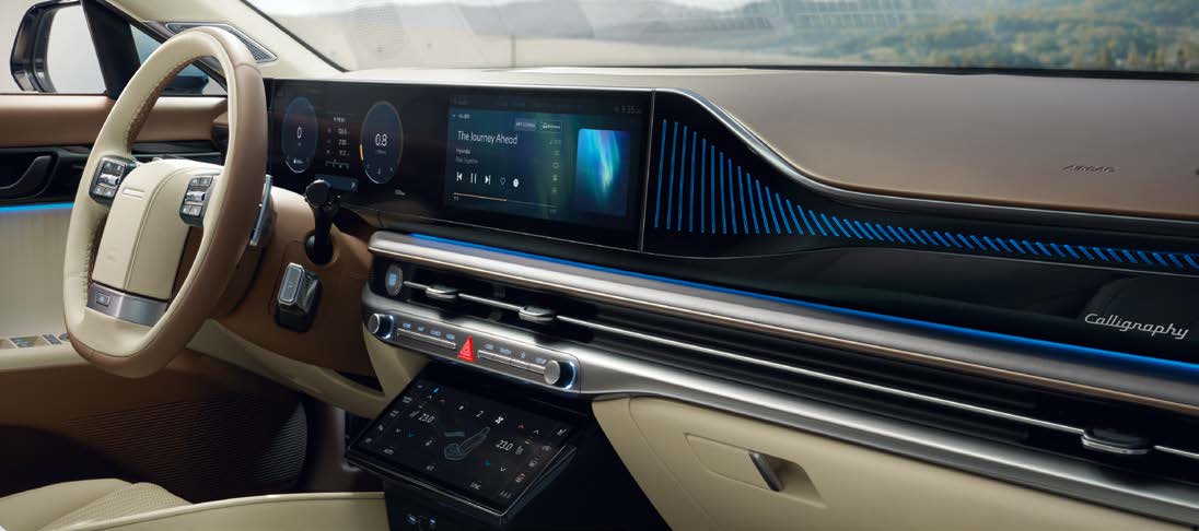 그랜저 하이브리드의 실내는 고급스러운 소재와 최신 기술이 조화를 이룹니다. 더욱 넓어진 실내 공간과 인간공학적으로 설계된 시트는 장거리 운전에서도 편안한 승차감을 보장합니다.