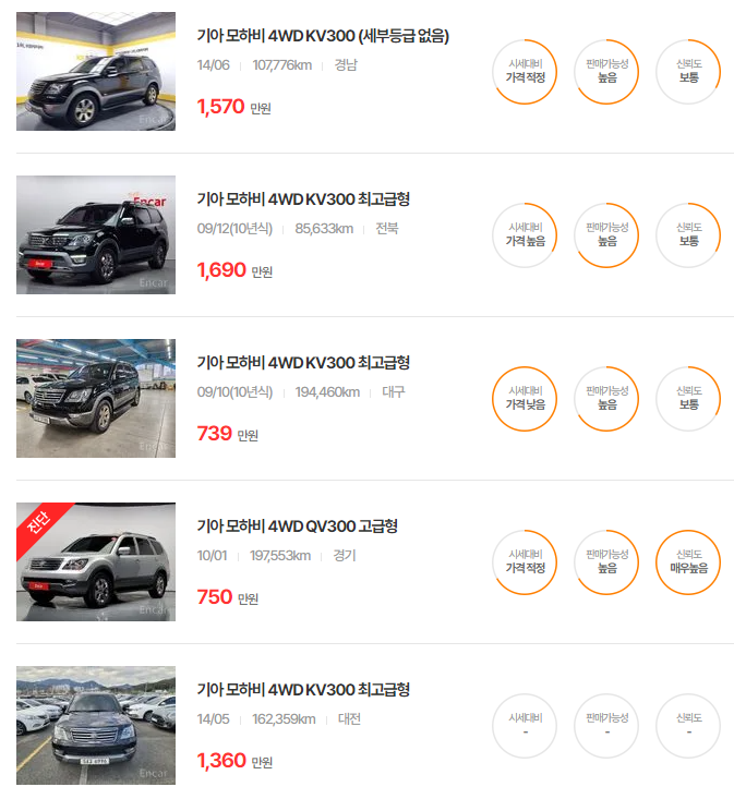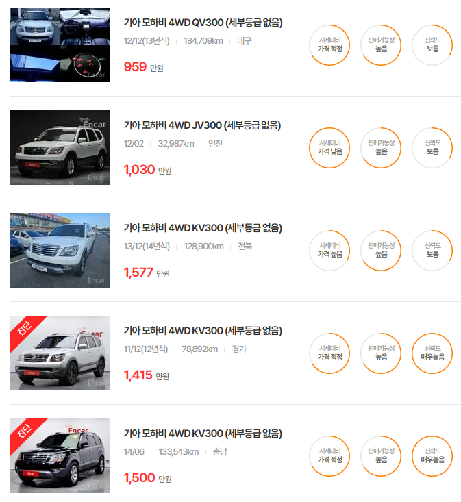모하비 더 마스터는 항상 인기 있는 선택이며, 특히 최근 연식일수록 중고차 시장에서 높은 가치를 유지하고 있습니다. 각 차량은 트림, 주행거리, 옵션에 따라 가격 차이가 나타납니다.