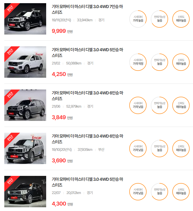 모하비 더 마스터는 항상 인기 있는 선택이며, 특히 최근 연식일수록 중고차 시장에서 높은 가치를 유지하고 있습니다. 각 차량은 트림, 주행거리, 옵션에 따라 가격 차이가 나타납니다.