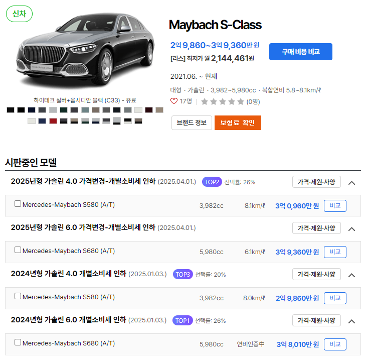2025 벤츠 마이바흐 S680의 기본 가격은 대략 3억 8,150만 원부터 시작하며, 옵션에 따라 가격은 변동될 수 있습니다. 트림별로 다양한 옵션을 제공하여 고객의 필요에 따른 맞춤 구성도 가능합니다. 예산 내에서 나에게 맞는 트림을 쉽게 찾기 위해서는 옵션 구성과 가격대를 비교하는 것이 좋습니다.