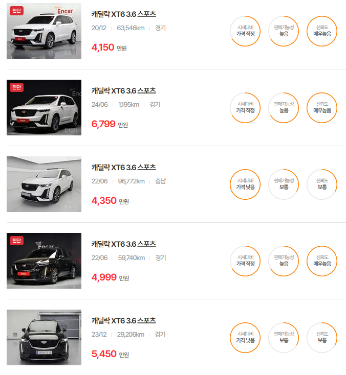 캐딜락 XT6 중고차 가격 시세표 | 25년 6월 기준