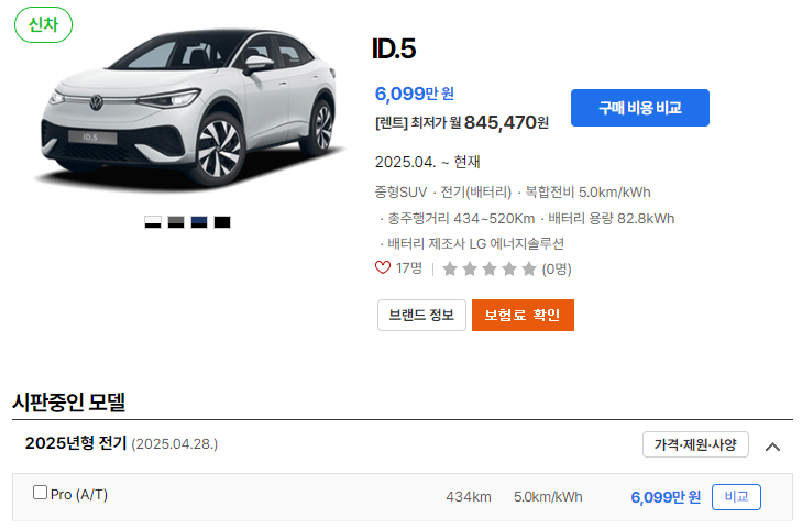 폭스바겐 ID.5의 초기 시작 가격은 6,099만 원부터 시작합니다. 차량의 트림 및 선택 옵션에 따라 가격은 달라질 수 있습니다. 기본 모델인 Pro (A/T)은 434km의 주행 가능 거리와 5.0㎞/kWh의 복합전비를 제공합니다. 2025년형 전기 모델은 사전 계약하여 예약할 수 있으며, 옵션에 따라 가격이 변동될 수 있으니, 옵션 구성과 가격대를 비교해보면 나에게 맞는 트림을 찾기 쉬워집니다.