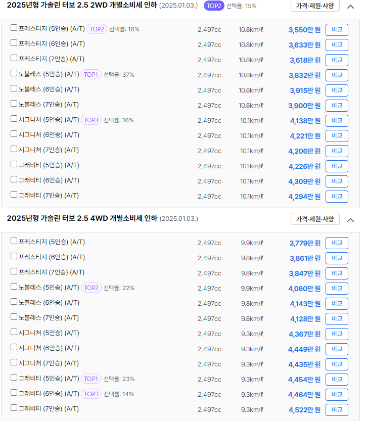 2025 쏘렌토는 2.5리터 가솔린 터보 및 2.2리터 디젤 엔진을 채택하고 있으며, 각 모델의 제원은 아래와 같습니다.